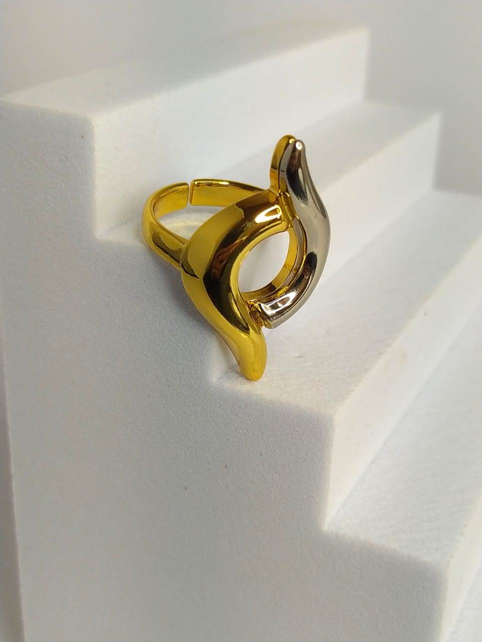 Anel em metal, tamanho ajustável, em formato de curvas com mix de tons dourado e prateado, banhado a ouro (flash). Uma peça de design minimalista, super estilosa, que facilmente combina com outros acessórios de ambos os tons.