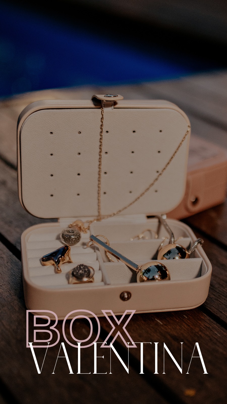 🔸 Na sua primeira box, você recebe um porta-joias personalizado Valentina Toda Fina – prático, lindo e exclusivo para guardar e levar seus acessórios com charme