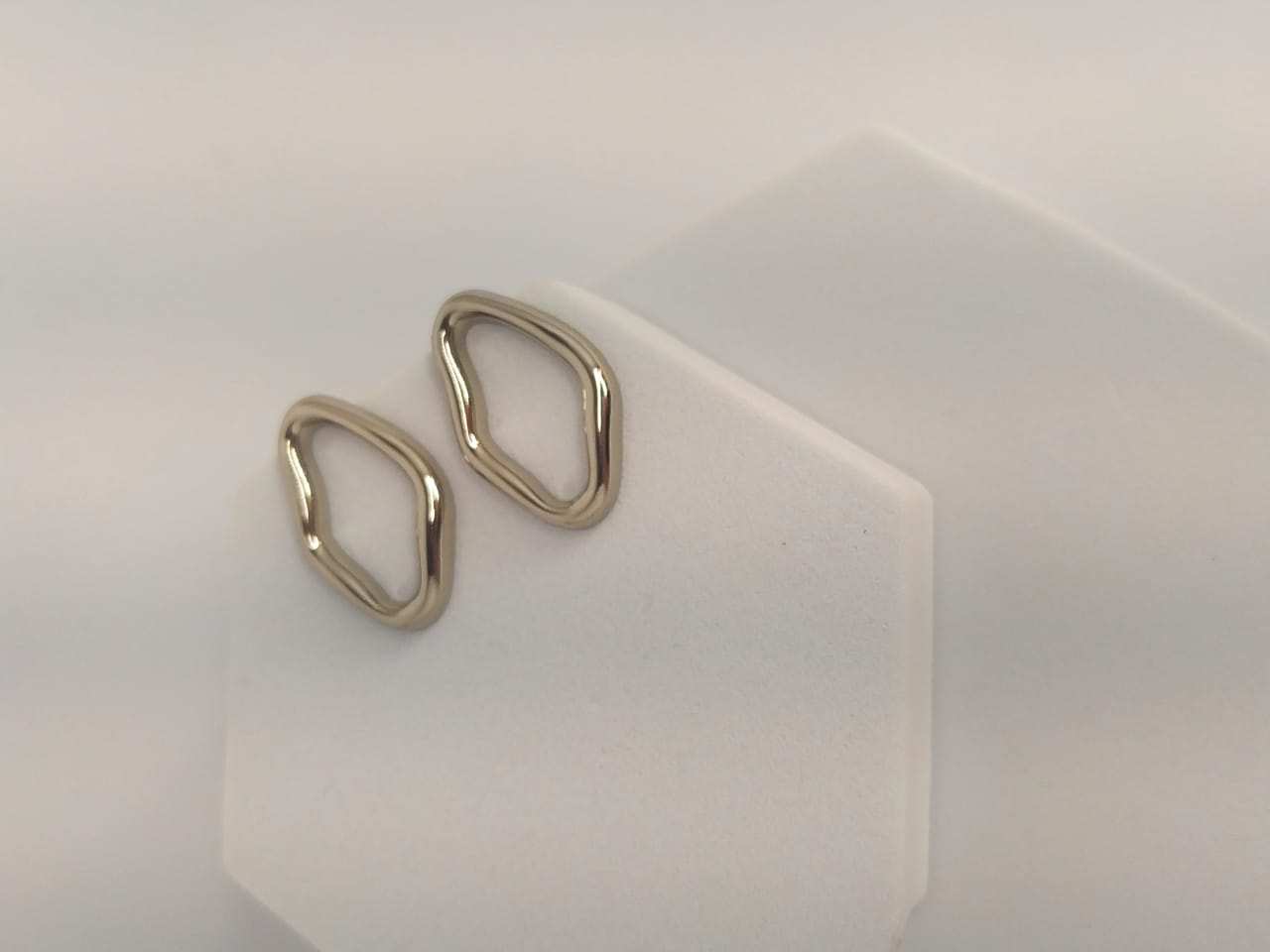 Brinco em metal, formato de argola orgânica, acabamento polido, disponível nas opções de banho dourado e prateado. Uma peça de fino acabamento, minimalista, elegante.