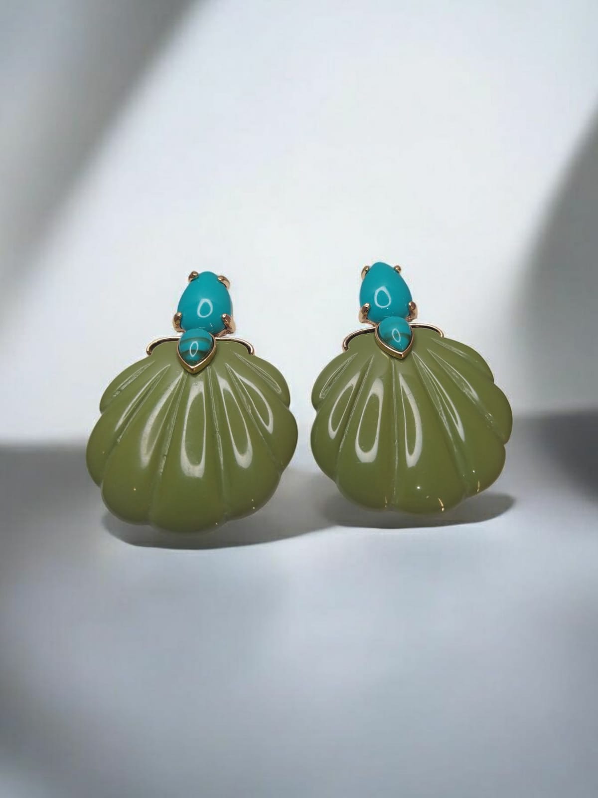 Brinco grande (6cm x 4,5cm), estrutura em metal de banho dourado, com aplicação de resinas na cor azul ciano e formato de concha do mar no tom verde oliva. Uma peça de presença, para dar destaque aos looks modernos, estilosos e de personalidade!