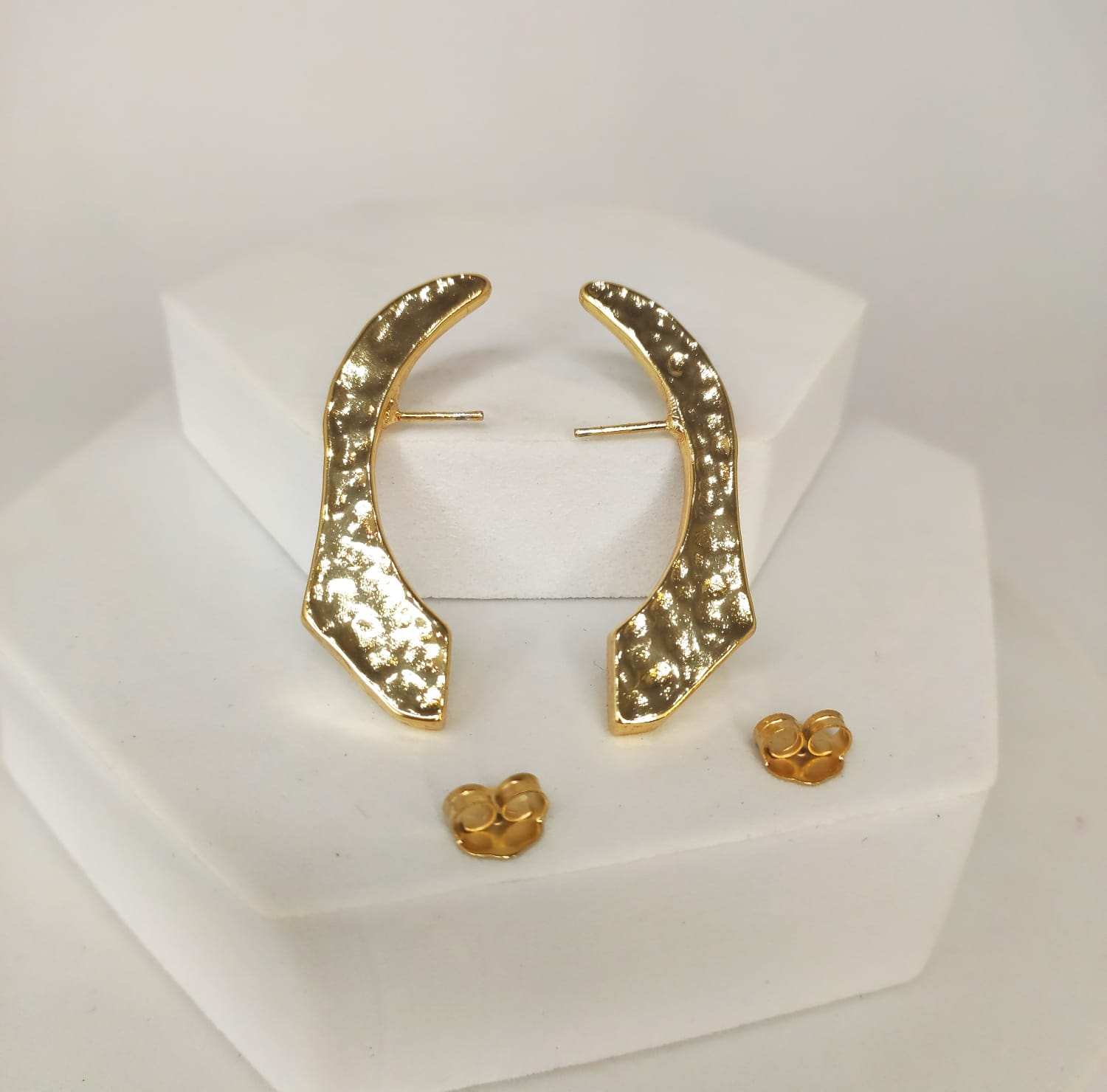 Brinco de metal, polido, com efeito martelado, em formato de meia lua irregular, estilizado. Uma peça de design moderno e estiloso!