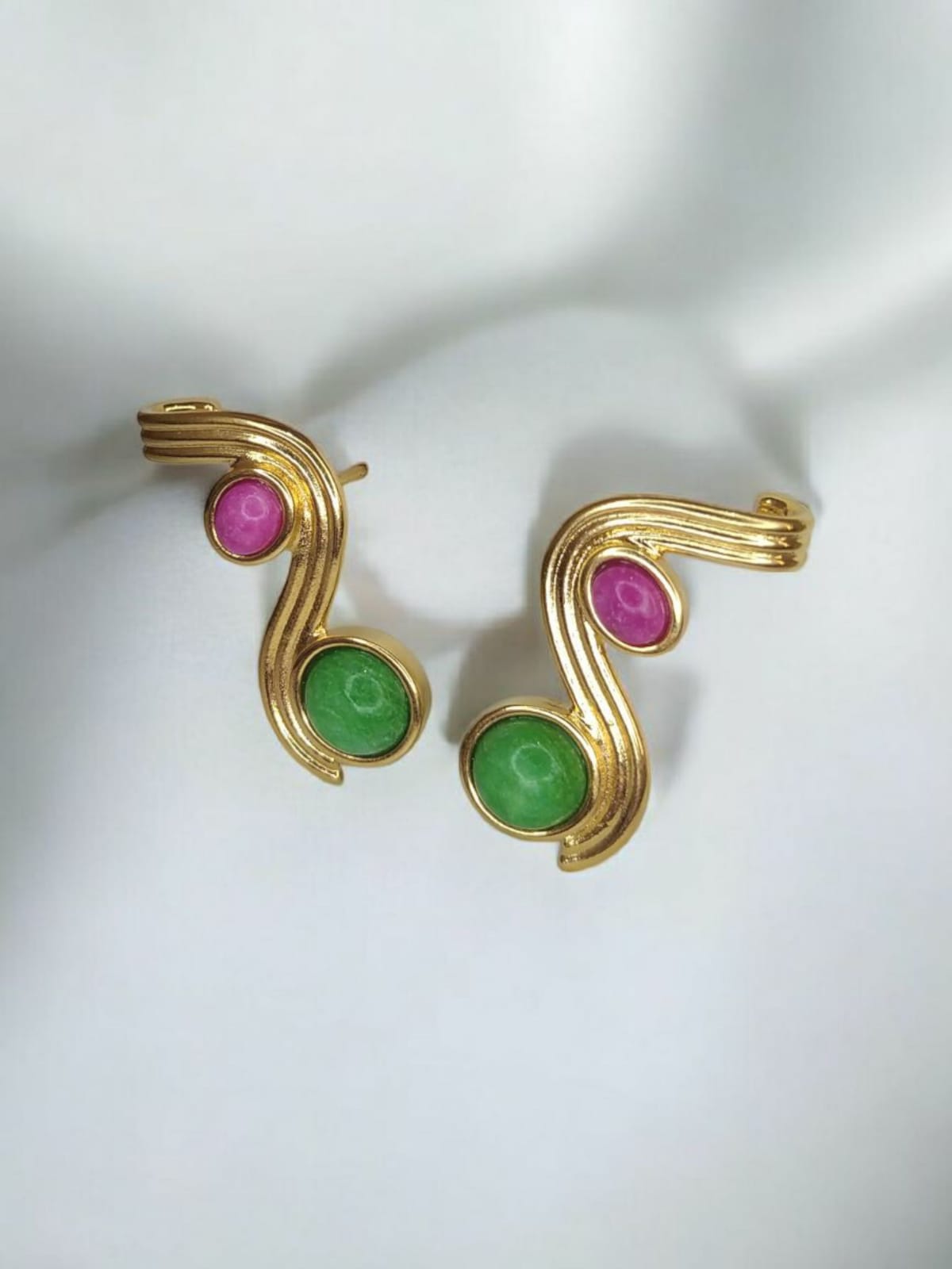 Brinco dourado elegante, composto por pedras naturais de quartzo rosa e jade Malásia. A peça harmoniza a suavidade do quartzo rosa, conhecido por sua energia delicada e romântica, com a tonalidade intensa e sofisticada da jade Malásia, trazendo um contraste encantador.