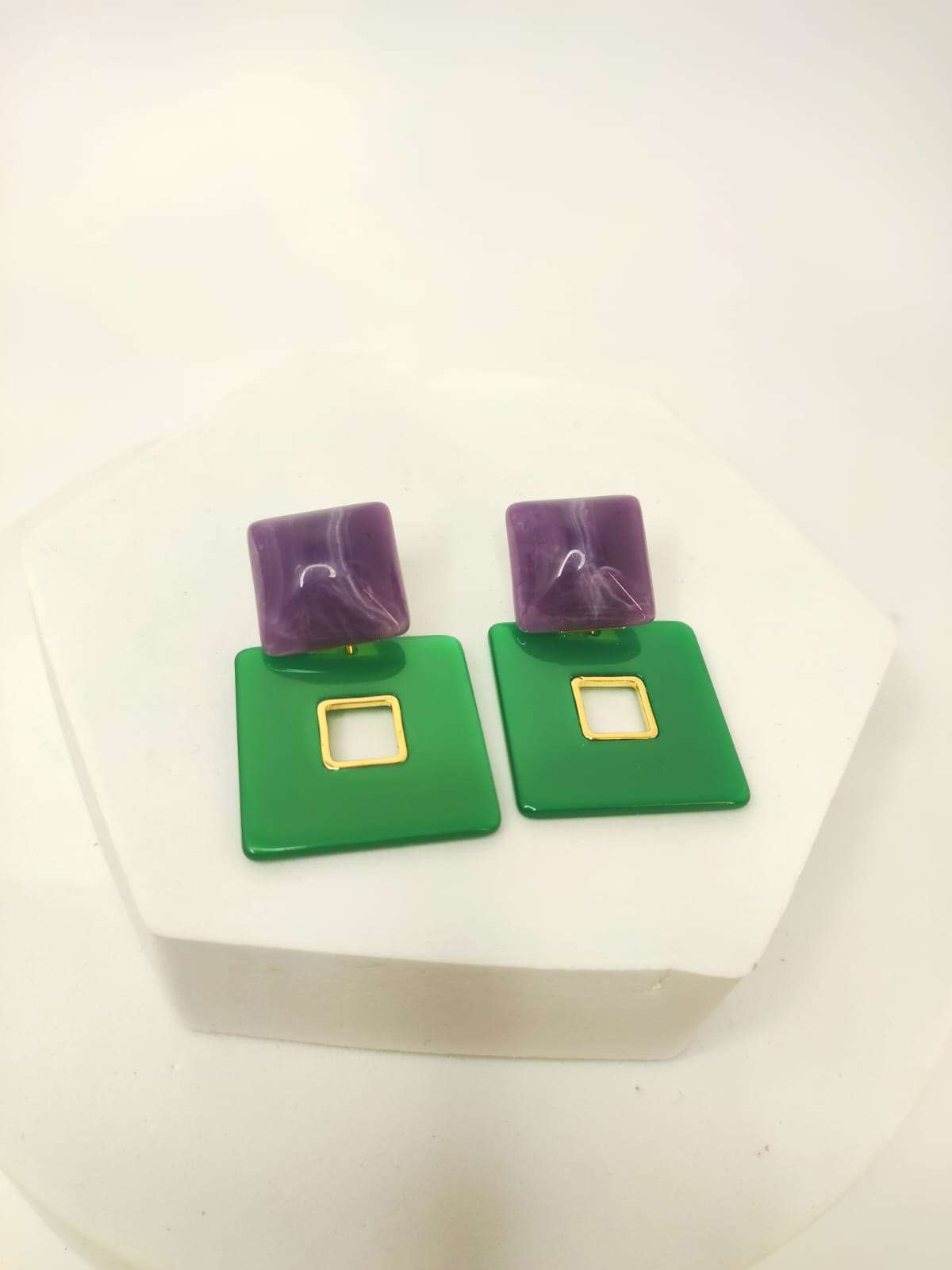 Brinco grande em formato de quadrado, vazado, com friso de acabamento dourado, em acrílico e resina. Uma peça de design minimalista, que une cores complementares. Use-o para complementar looks modernos e elegantes!