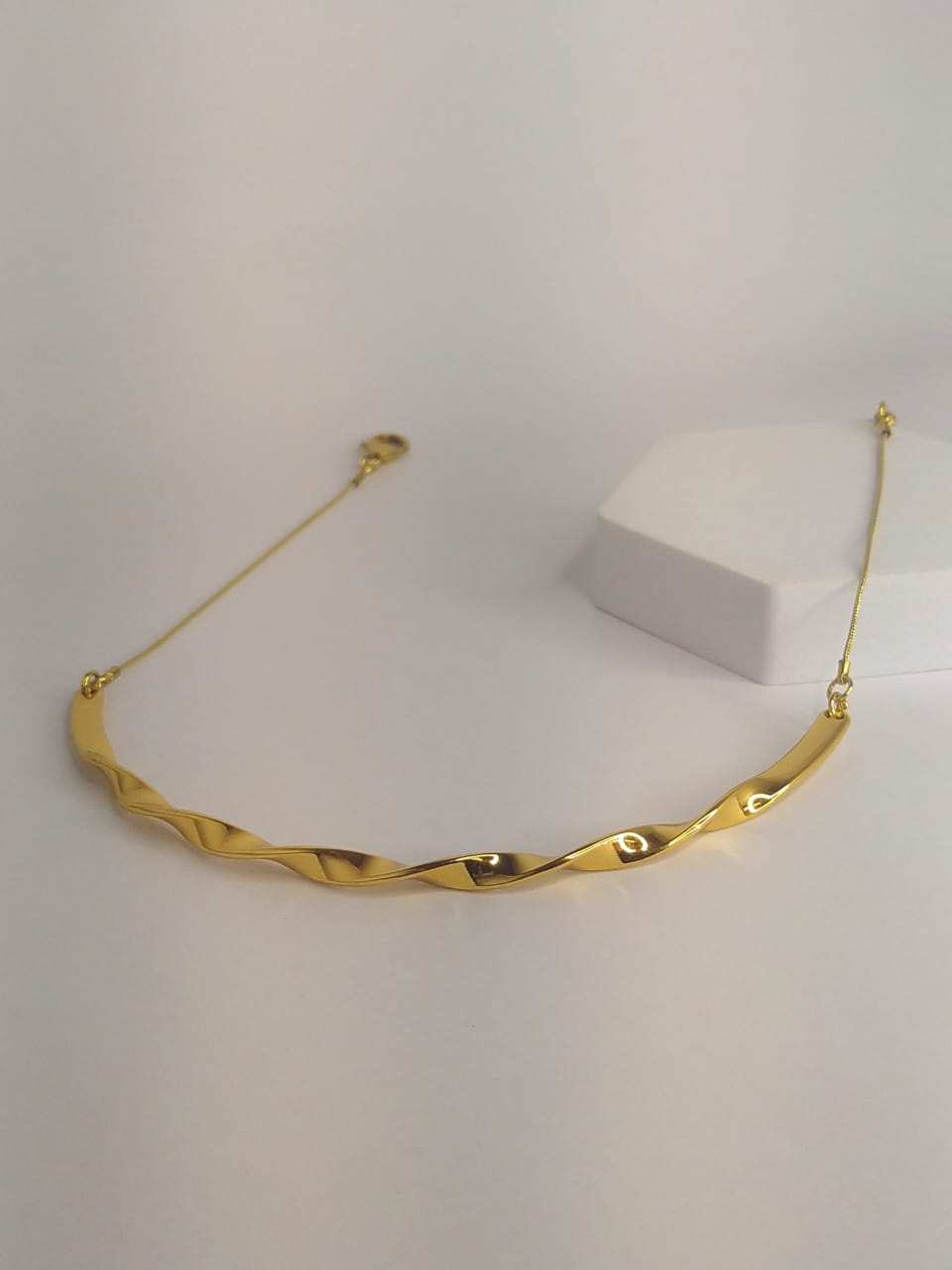 Colar curto, tipo choker, dourada, acabamento polido, com haste de efeito torcido, corrente rabo de rato, fecho lagosta. Uma peça minimalista, que pode ser usada em looks mais básicos, sozinha, ou acompanhada de colares alongados, para um visual mais elaborado.