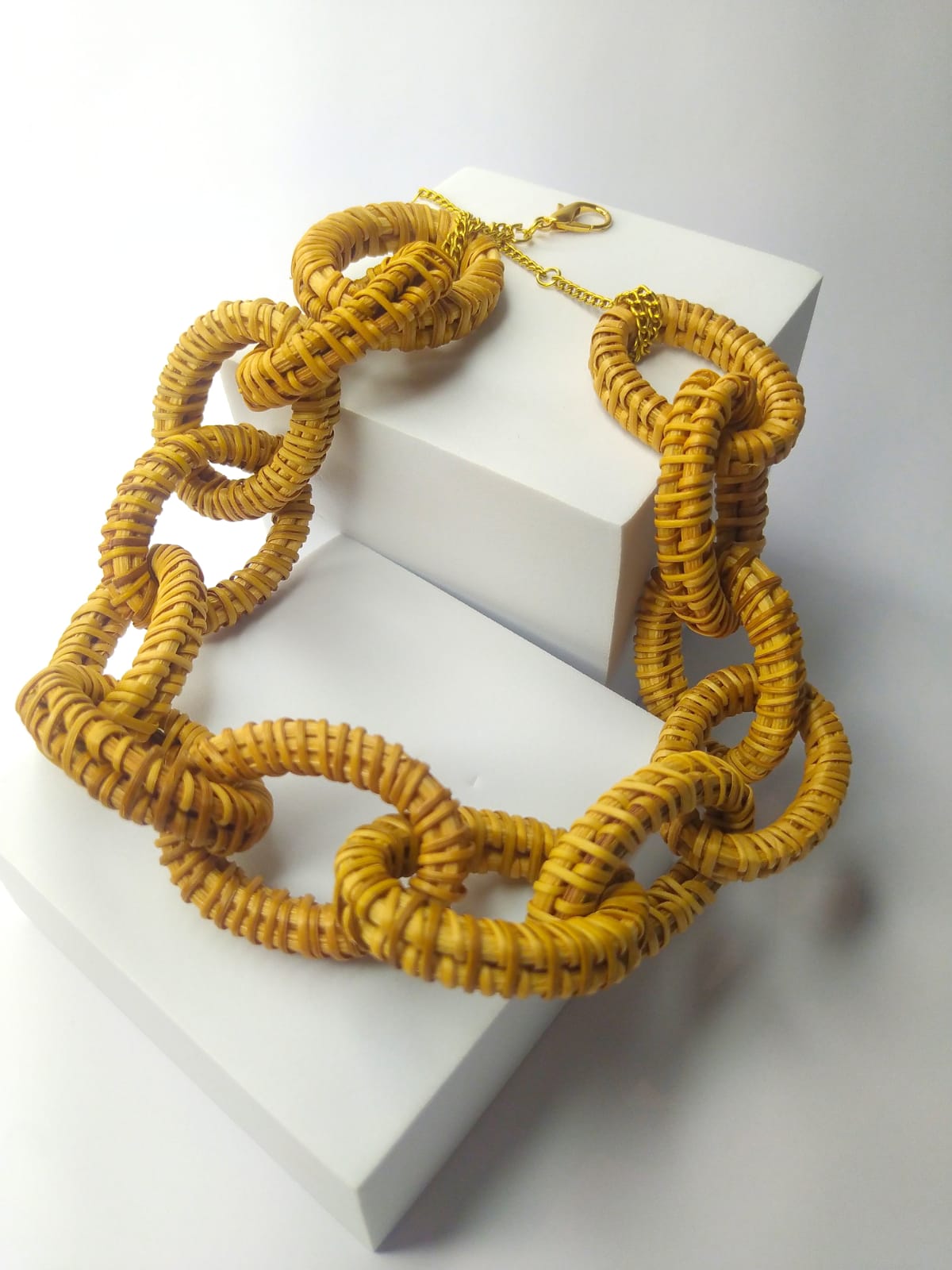 Colar medindo 51 cm, tendo ajuste de mais 8 cm de extensor. Peça super leve, moderna e elegante. Compõe com outras peças que podem ser em metal ou palha. Ponto focal em qualquer look.