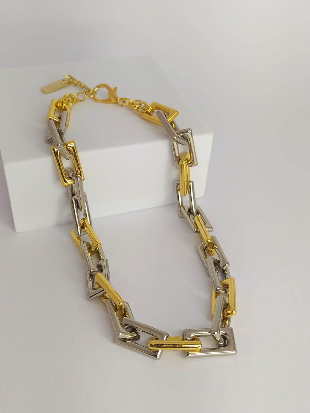 Colar de elos retangulares de metal, em mix de banhos dourado e prateado, fecho lagosta e corrente extensora. Acabamento brilhante, polido.