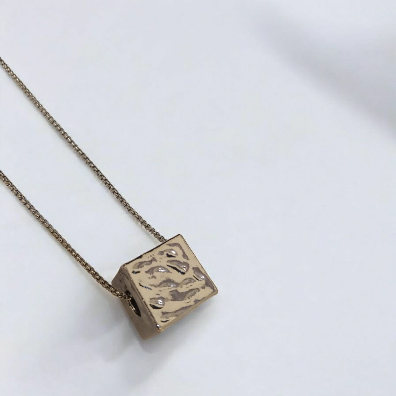Moderno e cheio de estilo, este colar longo traz um pingente em formato de cubo com acabamento martelado, que reflete a luz de forma única e adiciona textura ao visual. Uma peça versátil e elegante, perfeita para compor looks sofisticados ou criar sobreposições cheias de personalidade.