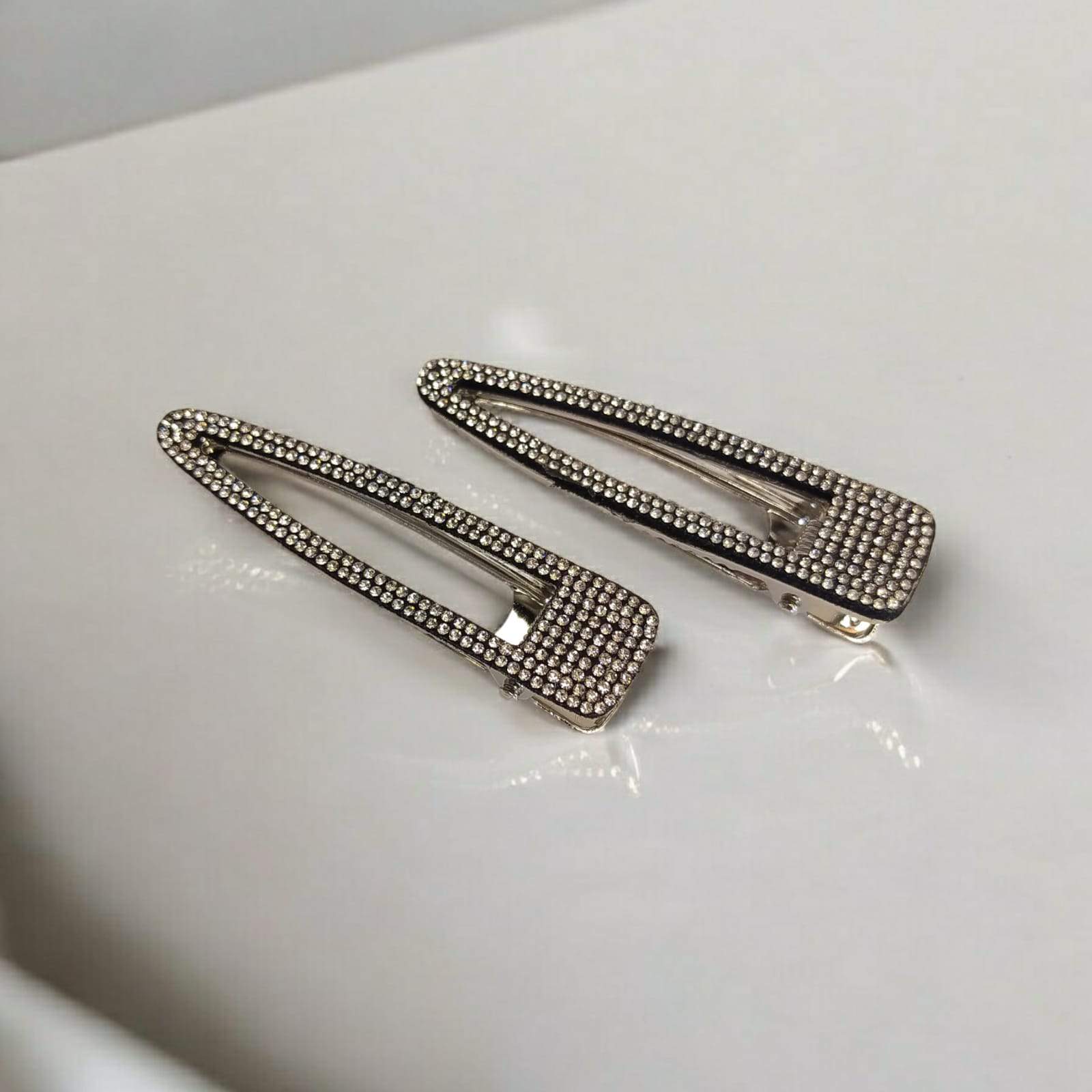 Par de presilhas para cabelo, 6,5cm de comprimento, com aplicações de mini strass em fundo preto. A peça é tipo bico de pato e tem um leve serrilhado para melhor fixação.
